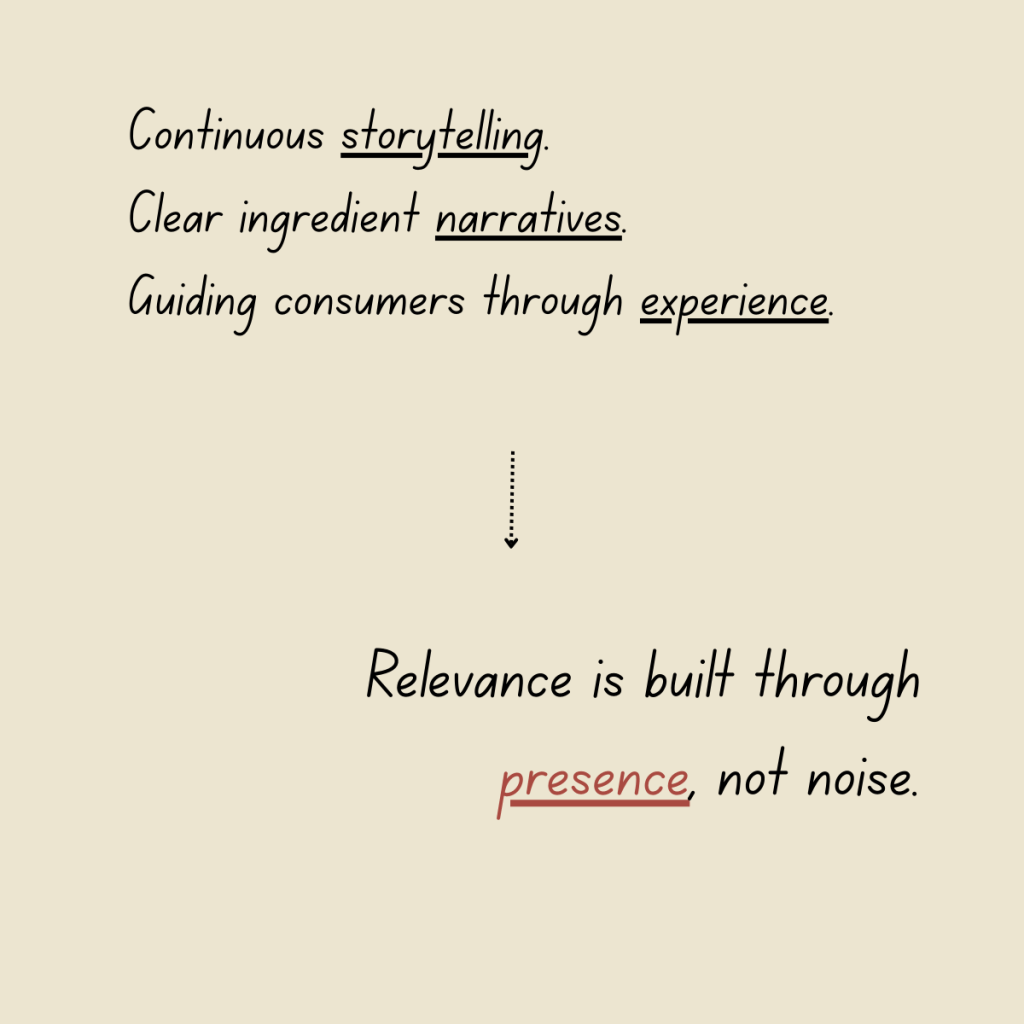 From multi-step routines to concepts like skin cycling, storytelling unfolds through action. Consumers are guided through process rather than persuasion. The product becomes part of a sequence — integrated into habit and repetition.