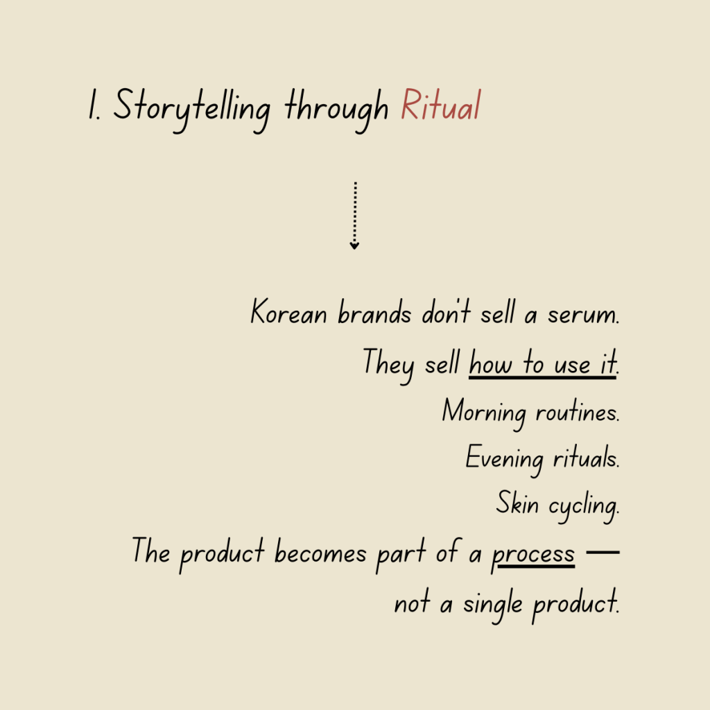 Rather than focusing primarily on seasonal launches, many Korean brands embed themselves into everyday life — morning routines, evening care, and small moments of repetition. Products are not simply presented; they are taught, practiced, and lived.