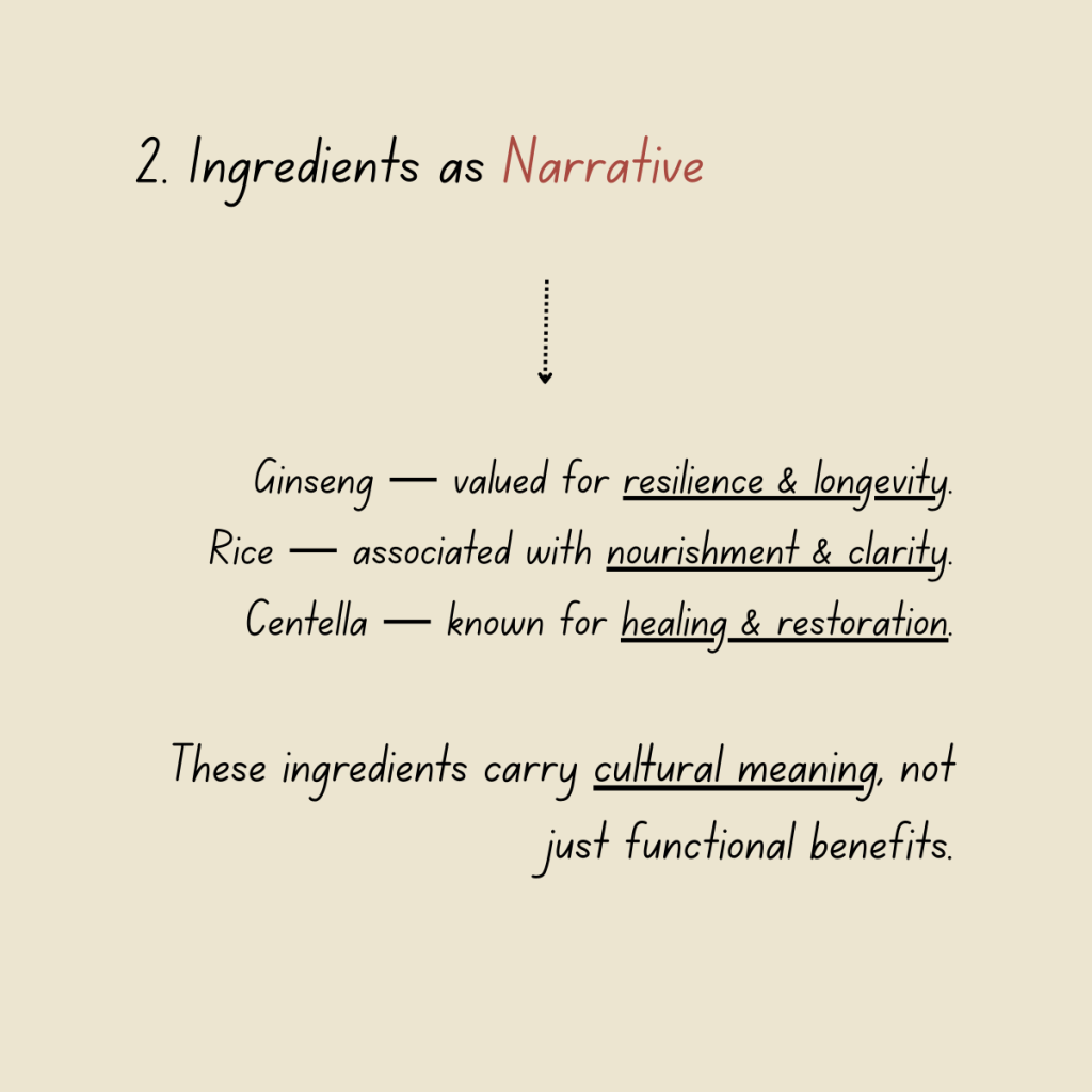 These elements carry meaning beyond formulation. They connect product to history, place, and purpose. In doing so, they transform functional benefits into narrative anchors.